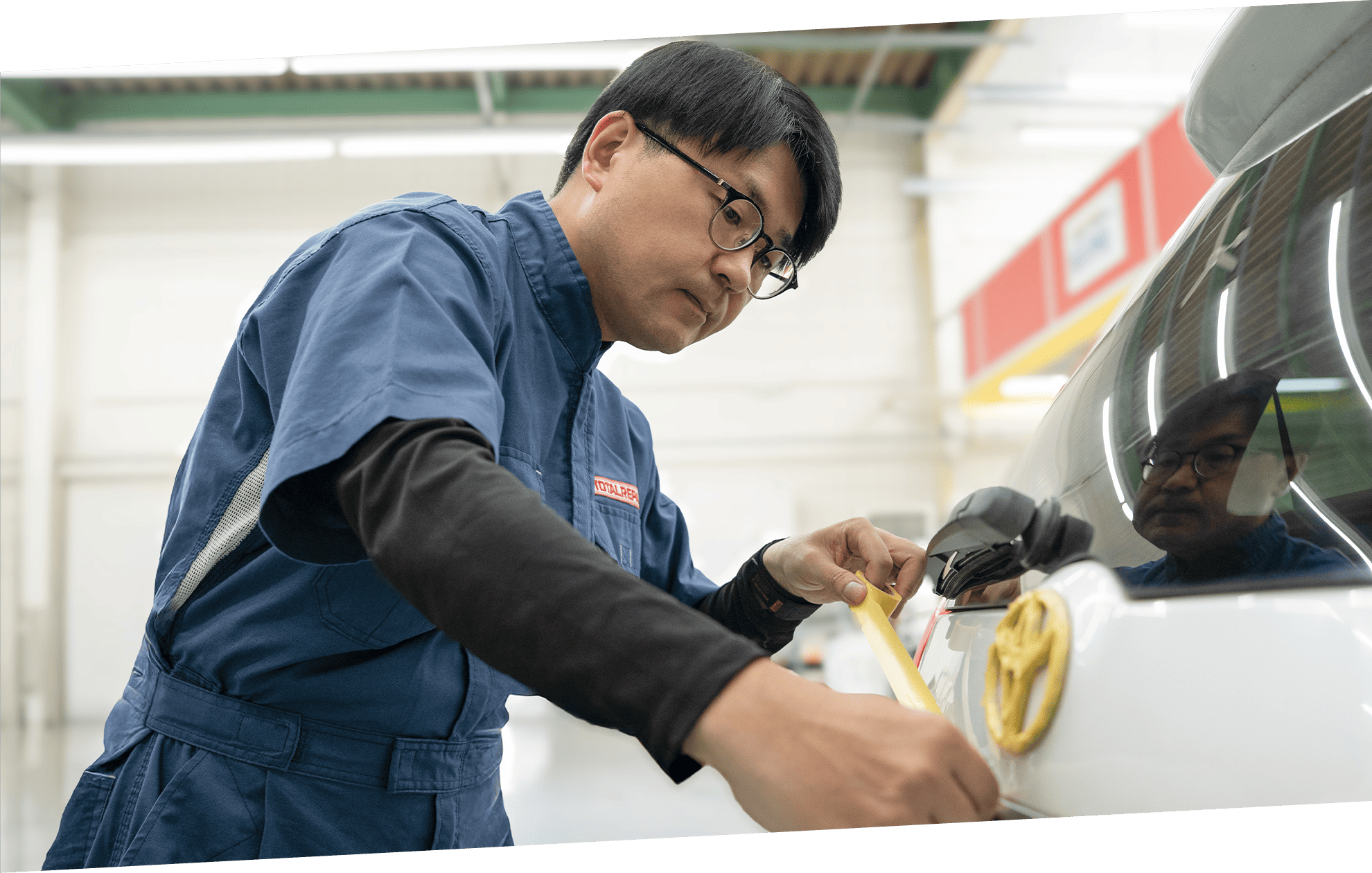 バンパーやフェンダー、ドアなど自動車外装に生じた傷をクイックに修復し、お客様への納車をスムーズにするお手伝いをさせていただきます。水性補修塗料を主に使用するため、安全面に配慮した施工を実現。出張での施工を可能にしました。そのため一般的な板金修理よりも大幅に納期と価格を抑えながら、お車を綺麗にさせていただきます。