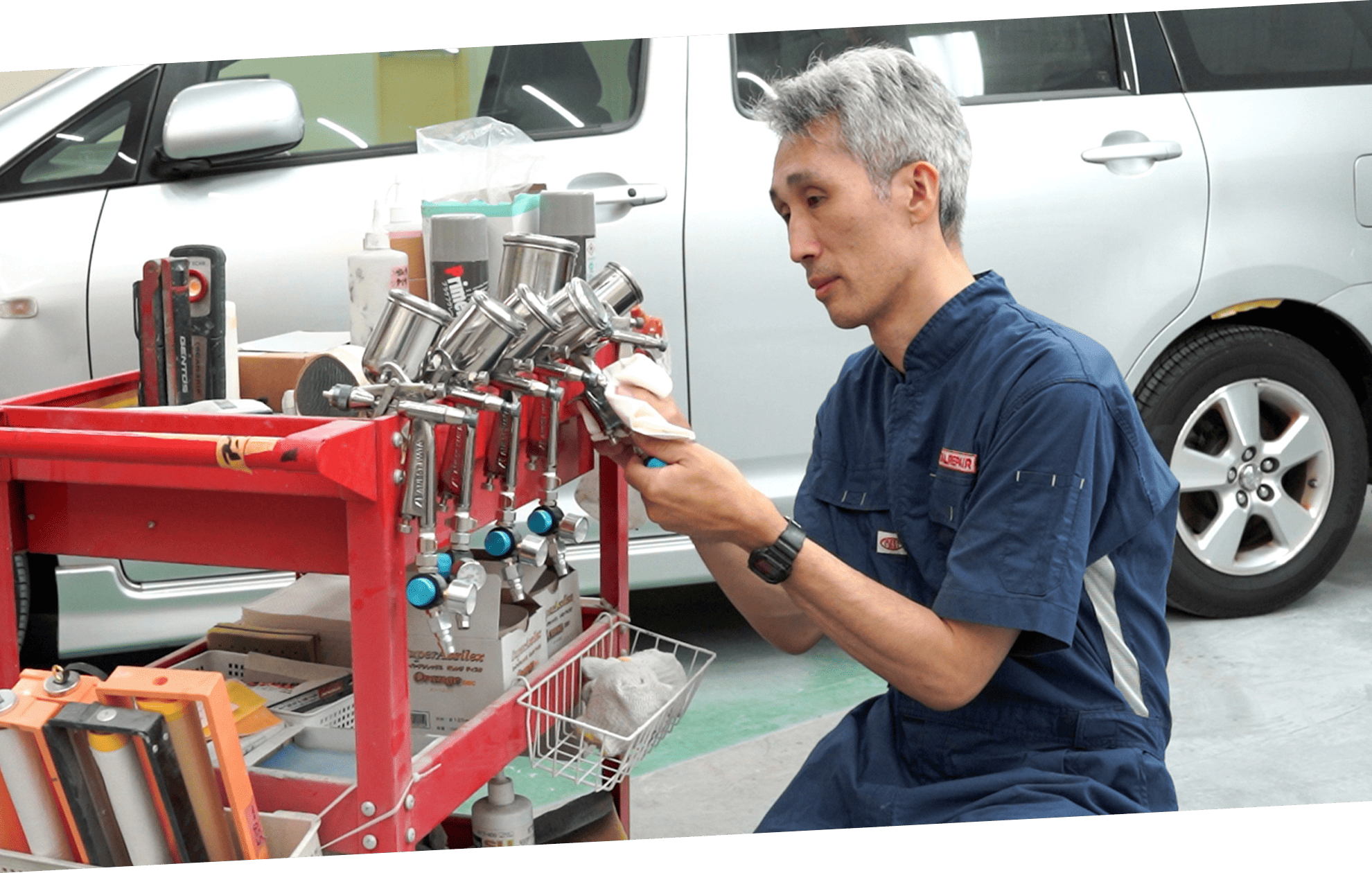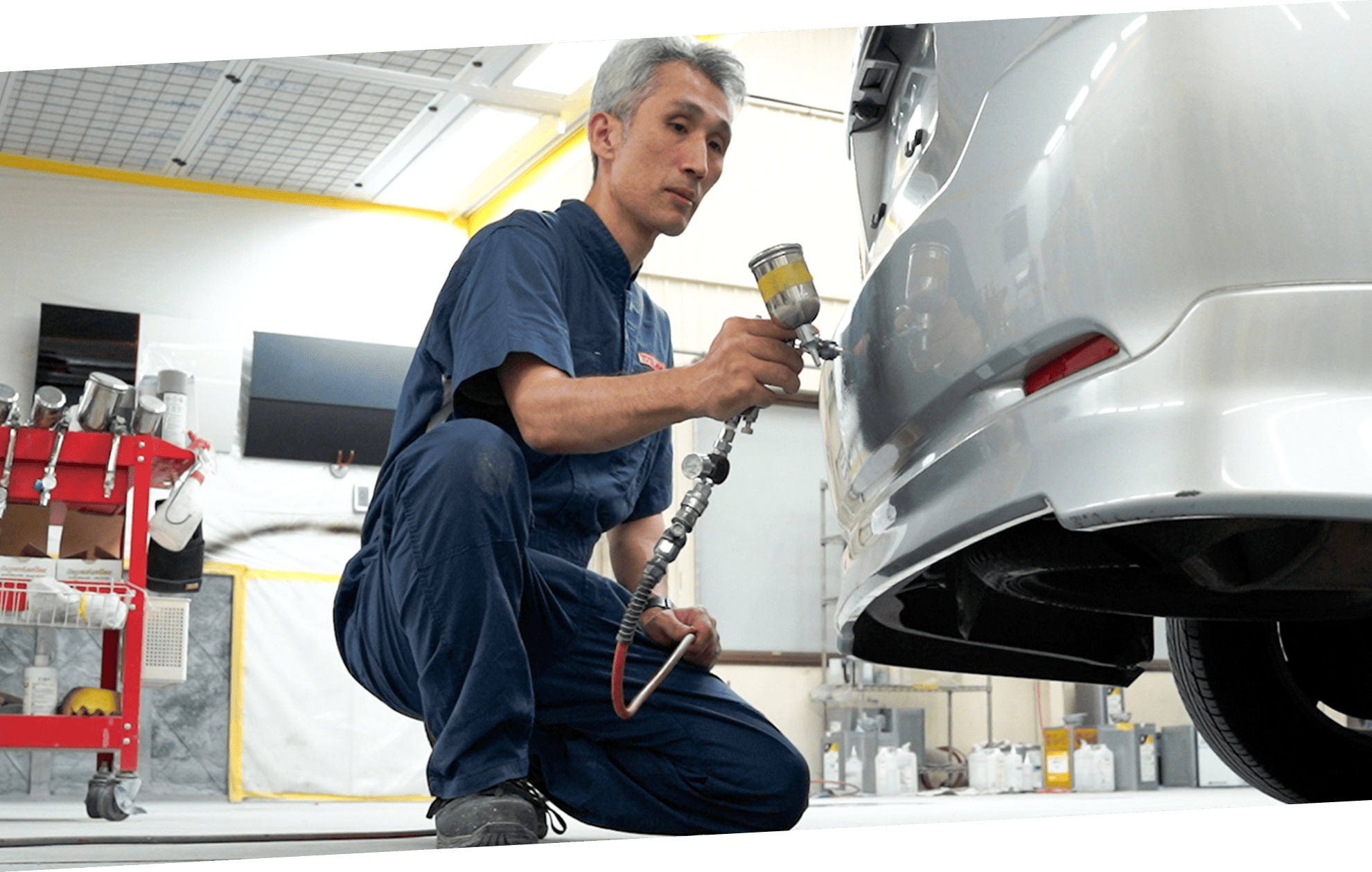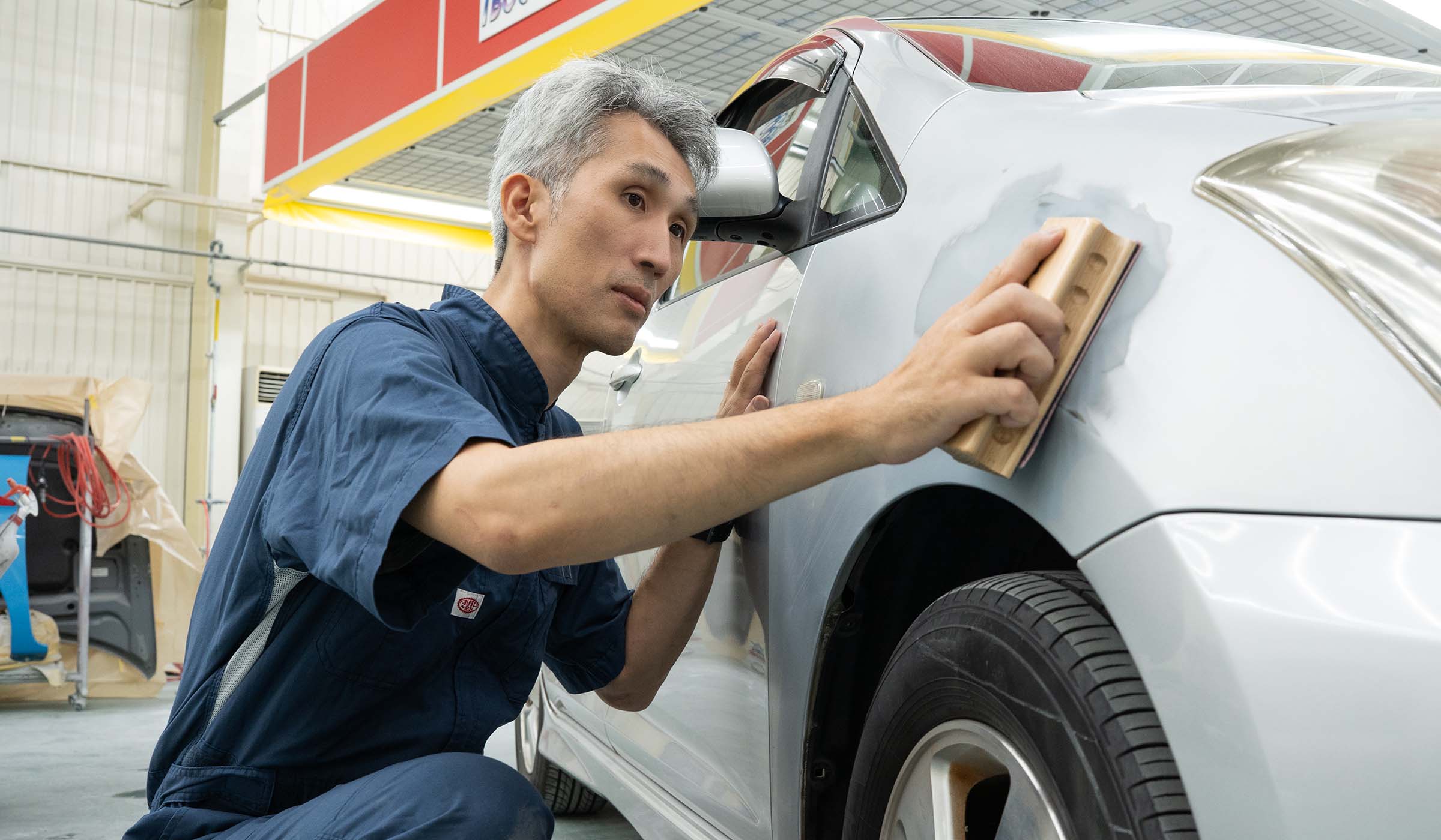 バンパーやフェンダー、ドアなど自動車外装に生じた傷をクイックに修復し、お客様への納車をスムーズにするお手伝いをさせていただきます。水性補修塗料を主に使用するため、安全面に配慮した施工を実現。出張での施工を可能にしました。そのため一般的な板金修理よりも大幅に納期と価格を抑えながら、お車を綺麗にさせていただきます。
