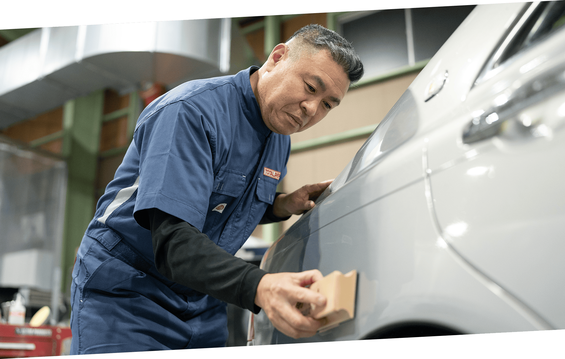 バンパーやフェンダー、ドアなど自動車外装に生じた傷をクイックに修復し、お客様への納車をスムーズにするお手伝いをさせていただきます。水性補修塗料を主に使用するため、安全面に配慮した施工を実現。出張での施工を可能にしました。そのため一般的な板金修理よりも大幅に納期と価格を抑えながら、お車を綺麗にさせていただきます。