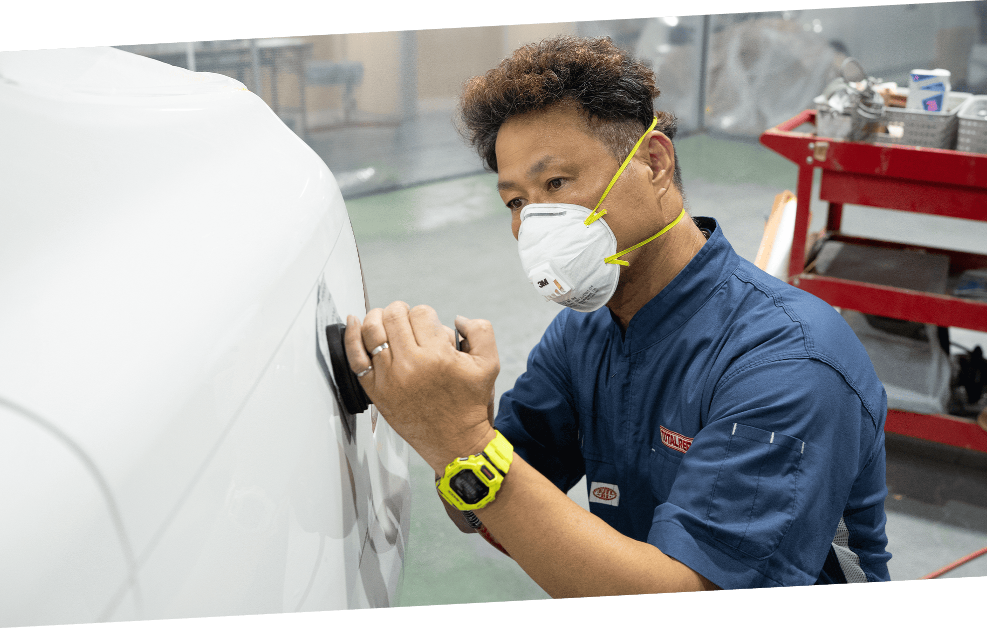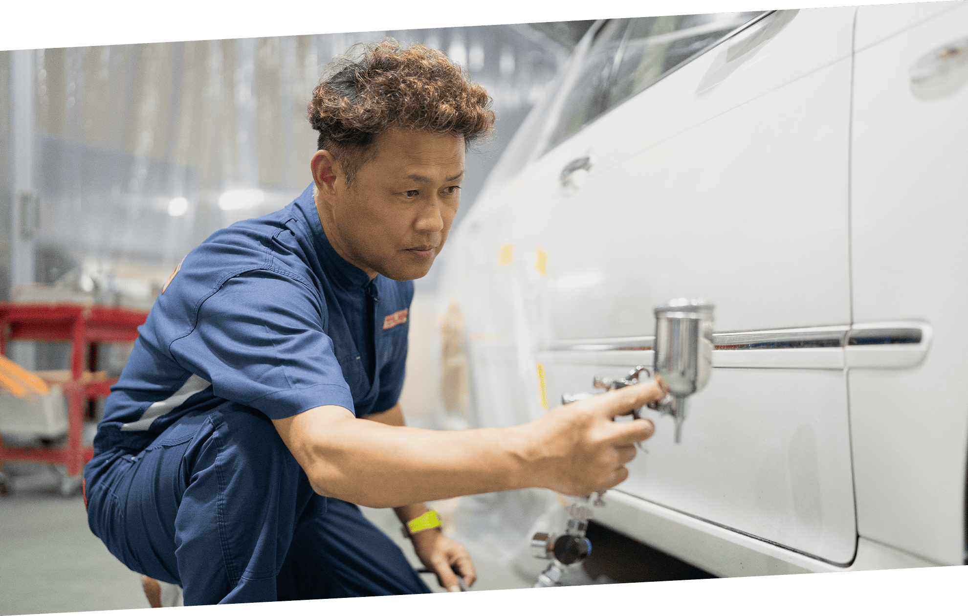 バンパーやフェンダー、ドアなど自動車外装に生じた傷をクイックに修復し、お客様への納車をスムーズにするお手伝いをさせていただきます。水性補修塗料を主に使用するため、安全面に配慮した施工を実現。出張での施工を可能にしました。そのため一般的な板金修理よりも大幅に納期と価格を抑えながら、お車を綺麗にさせていただきます。