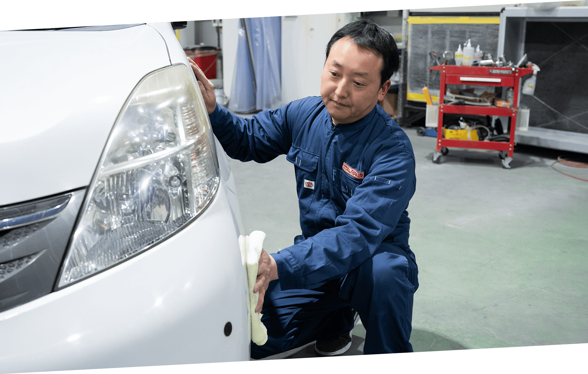 バンパーやフェンダー、ドアなど自動車外装に生じた傷をクイックに修復し、お客様への納車をスムーズにするお手伝いをさせていただきます。水性補修塗料を主に使用するため、安全面に配慮した施工を実現。出張での施工を可能にしました。そのため一般的な板金修理よりも大幅に納期と価格を抑えながら、お車を綺麗にさせていただきます。