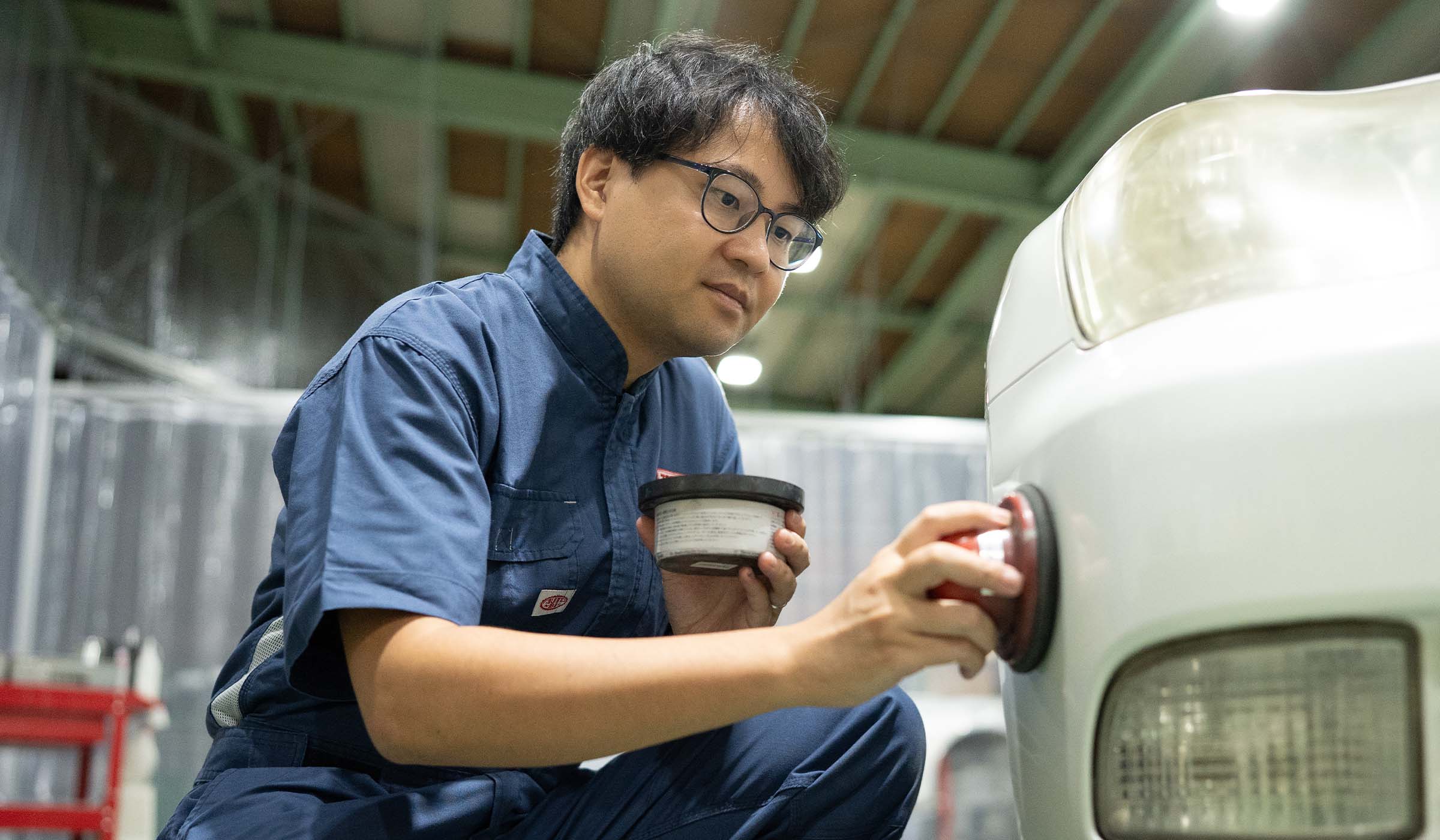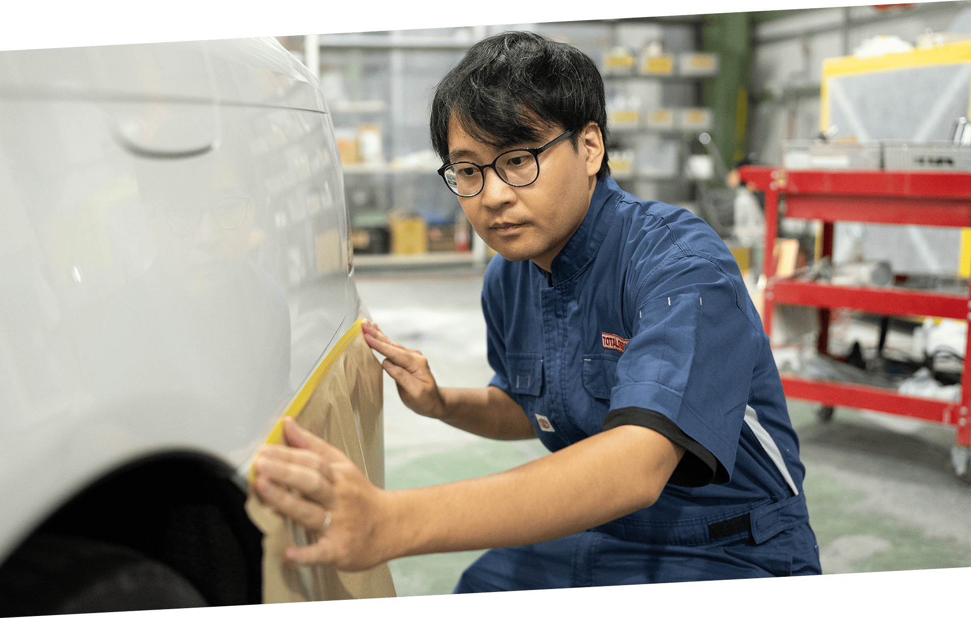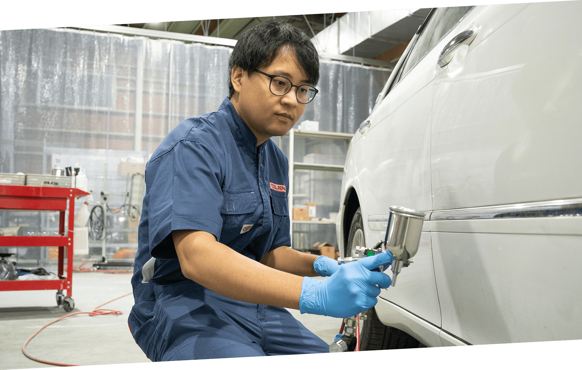 バンパーやフェンダー、ドアなど自動車外装に生じた傷をクイックに修復し、お客様への納車をスムーズにするお手伝いをさせていただきます。水性補修塗料を主に使用するため、安全面に配慮した施工を実現。出張での施工を可能にしました。そのため一般的な板金修理よりも大幅に納期と価格を抑えながら、お車を綺麗にさせていただきます。