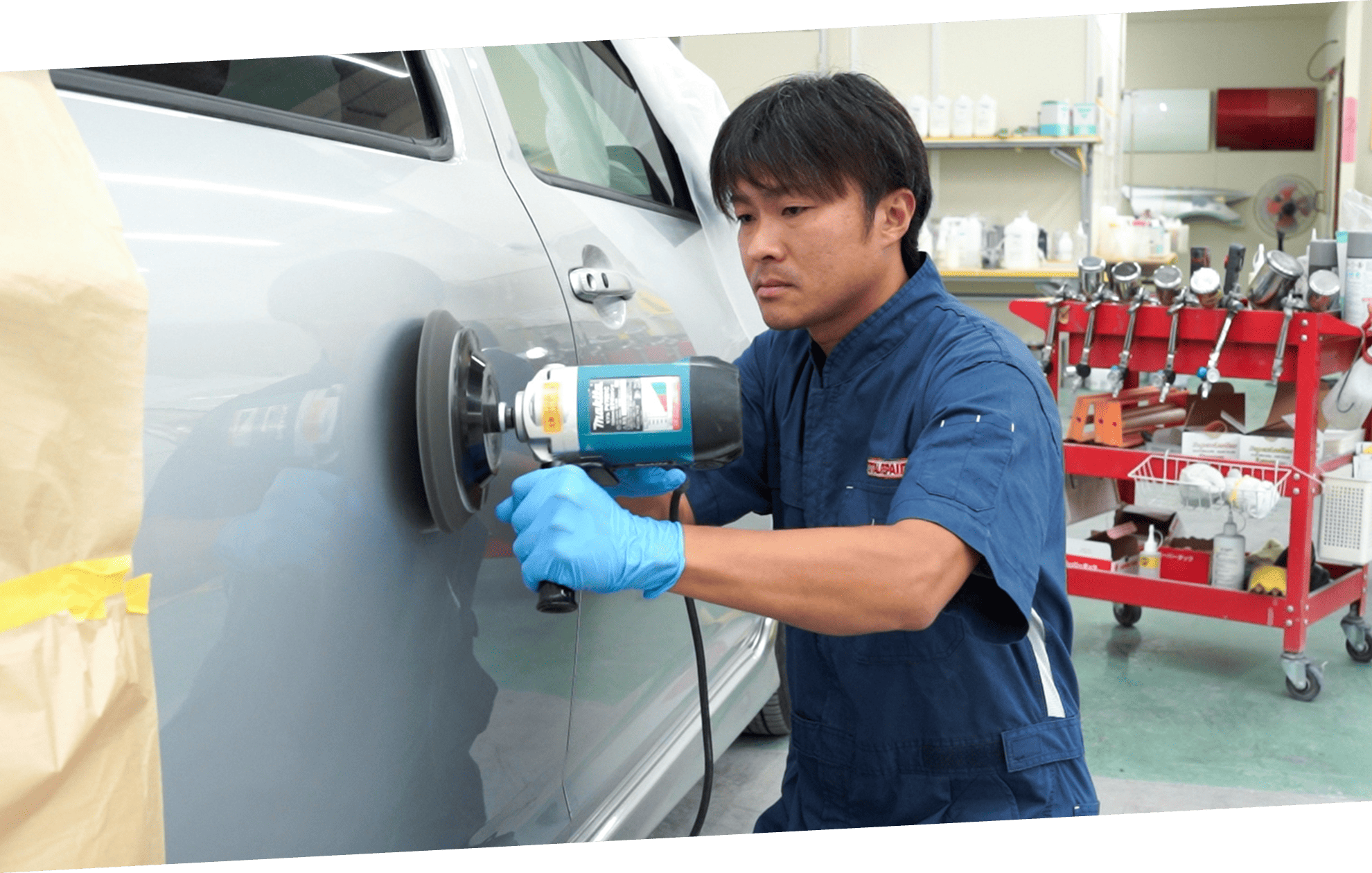 バンパーやフェンダー、ドアなど自動車外装に生じた傷をクイックに修復し、お客様への納車をスムーズにするお手伝いをさせていただきます。水性補修塗料を主に使用するため、安全面に配慮した施工を実現。出張での施工を可能にしました。そのため一般的な板金修理よりも大幅に納期と価格を抑えながら、お車を綺麗にさせていただきます。
