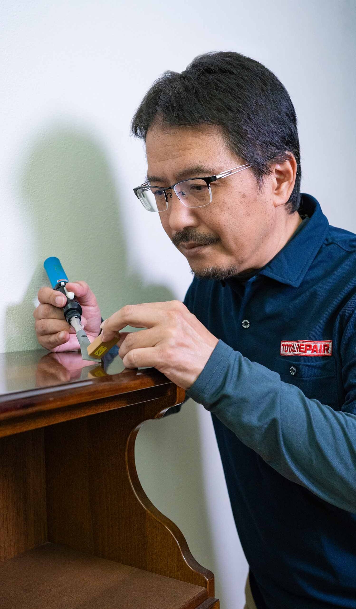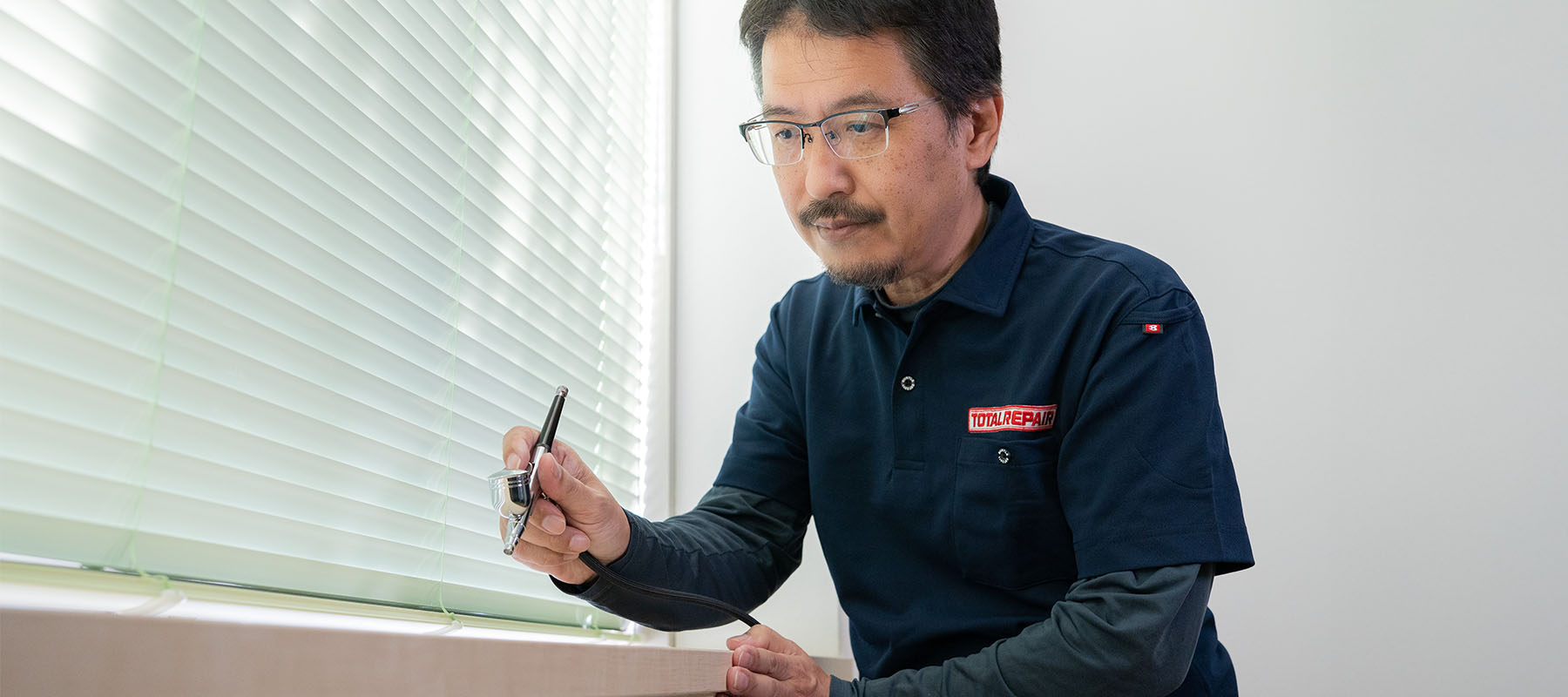 トータルリペアは、自動車や住宅をはじめ、家具、革製品などの傷や劣化を修復するサービスを全国規模で展開しています。当店は、1,000店舗以上ある加盟店の一つとして、特に住宅関連のリペアに特化しております。