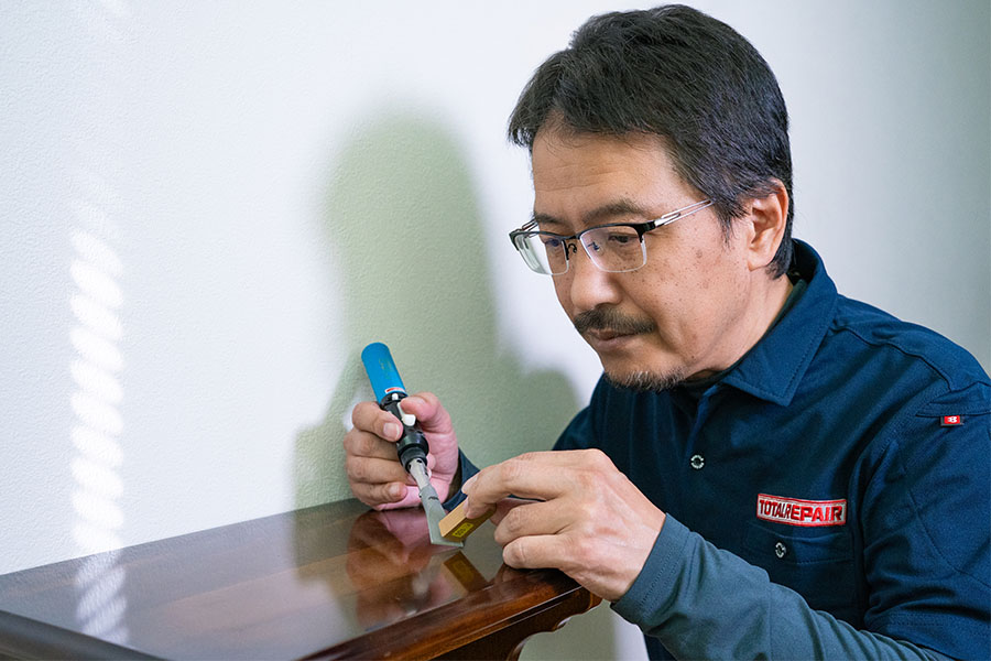 その中でも当店は住宅のフローリングや階段、家具などの木部についた傷やアルミ・樹脂サッシなどの傷を補修し、元の風合いを再現して住まいの問題を解決いたします。