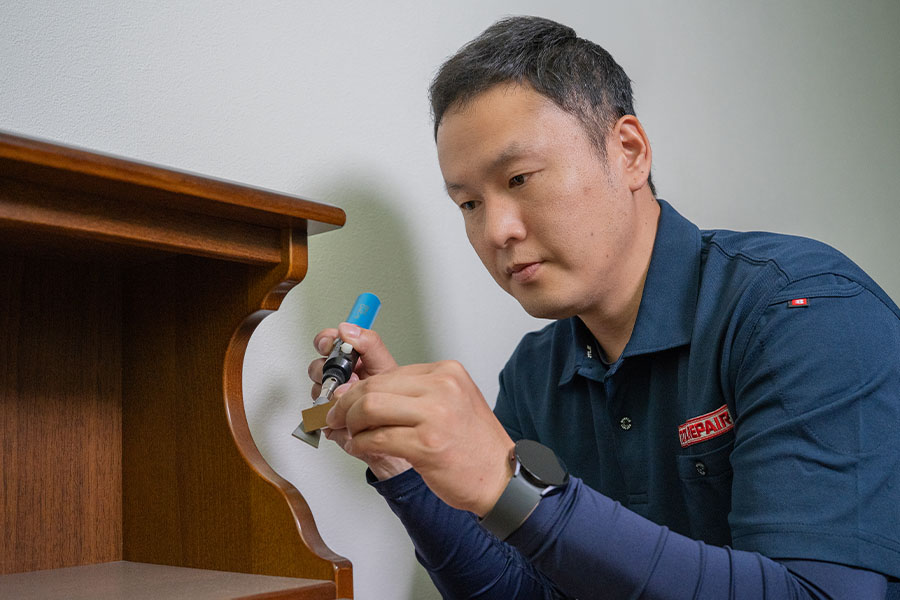 その中でも当店は住宅のフローリングや階段、家具などの木部についた傷やアルミ・樹脂サッシなどの傷を補修し、元の風合いを再現して住まいの問題を解決いたします。